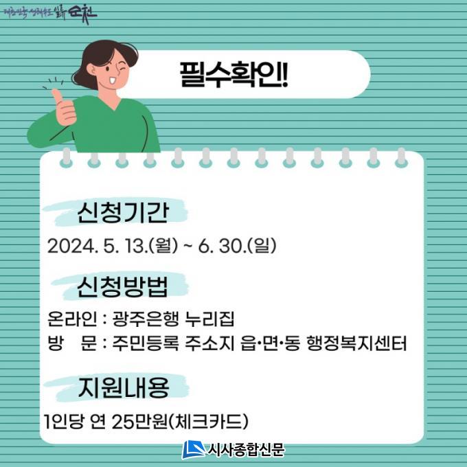 À̹ø ½ÅûÀڵ鿡 ´ëÇØ¼´Â 6¿ùºÎÅÍ 7¿ù±îÁö ´ë»óÀÚ Àû°Ý¿©ºÎ È®ÀÎ ÈÄ ¹®Èº¹Áöºñ¸¦ Áö¿øÇÒ ¿¹Á¤ÀÌ´Ù.»ç¿ë±â°£Àº ¿ÃÇØ ¿¬¸»±îÁöÀ̰í Àü³² µµ³» °¡¸ÍÁ¡¿¡¼ ¿ÀÇÁ¶óÀÎÀ¸·Î¸¸ »ç¿ë °¡´ÉÇÏ´Ù. °¡¸ÍÁ¡ ¸ñ·ÏÀº ¼øÃµ½Ã ´ëÇ¥ û³âÁ¤Ã¥ È«º¸ ä³ÎÀΠû³âÁ¤Ã¥114 ´©¸®Áý »õ¼Ò½Ä¿¡¼ È®ÀÎÀÌ °¡´ÉÇÏ´Ù. ÀÚ¼¼ÇÑ ³»¿ëÀº ¼øÃµ½Ãû ´©¸®Áý °ø°í¶õÀ» Âü°íÇϰųª û³âÁ¤Ã¥°ú ¶Ç´Â À¾‧¸é‧µ¿ ÇàÁ¤º¹Áö¼¾ÅÍ·Î ¹®ÀÇÇÏ¸é µÈ´Ù.