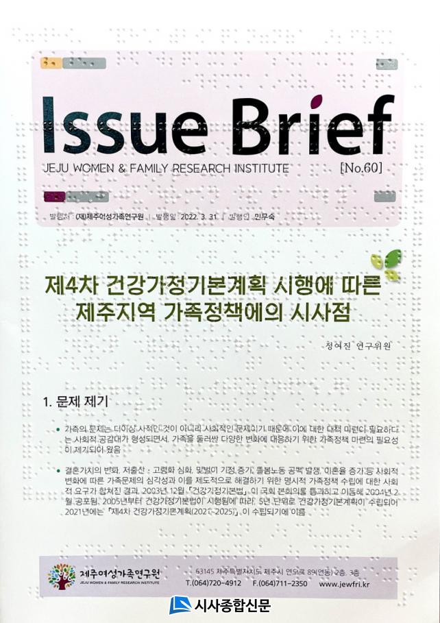 Á¦ÁÖ¿©¼º°¡Á·¿¬±¸¿ø¿¡¼´Â ¸Å³â 10°Ç ³»¿Ü ¡¸À̽´ºê¸®ÇÁ¡¹¸¦ ¹ß°£Çϴµ¥, ÀÌ Áß¿¡¼ Á¤Ã¥ Á¤º¸°øÀ¯ Á¤µµ¸¦ °í·ÁÇÏ¿© 5°Ç ³»¿Ü·Î Á¡¿ª(Á¡ÀÚ·Î ¹ø¿ª)ÇÏ¿©, Á¦ÁÖµµ ³» ½Ã°¢Àå¾ÖÀκ¹Áö°ü°ú Á¡ÀÚµµ¼°ü µî¿¡ Àü´ÞÇØ ¿Ô´Ù.