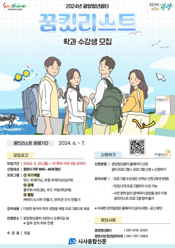 ÇÁ·Î±×·¥Àº ¡ã´í½º Æ®·¹ÀÌ´× ¡ãº¸Äà Ʈ·¹ÀÌ´× ¡ãÇöó¿ö ¾ÆÆ® ¡ã¿ìµå Ä«ºù(¸ñ°ø¿¹) ¡ãij¸¯ÅÍ µµ½Ã¶ô ¸¸µé±â ¡ã¹Ý·Á°ß °£½Ä ¸¸µé±â µîÀÌ´Ù. ¼ö° ½ÅûÀº ±¤¾çû³â²ÞÅÍ È¨ÆäÀÌÁö(www.gwangyang.go.kr/youth)¿¡¼ ¿Â¶óÀÎÀ¸·Î¸¸ °¡´ÉÇϸç, 18¼¼ ÀÌ»ó 45¼¼ ÀÌÇÏ ±¤¾ç½Ã û³âÀÌ¸é ´©±¸³ª Âü¿©ÇÒ ¼ö ÀÖ´Ù.