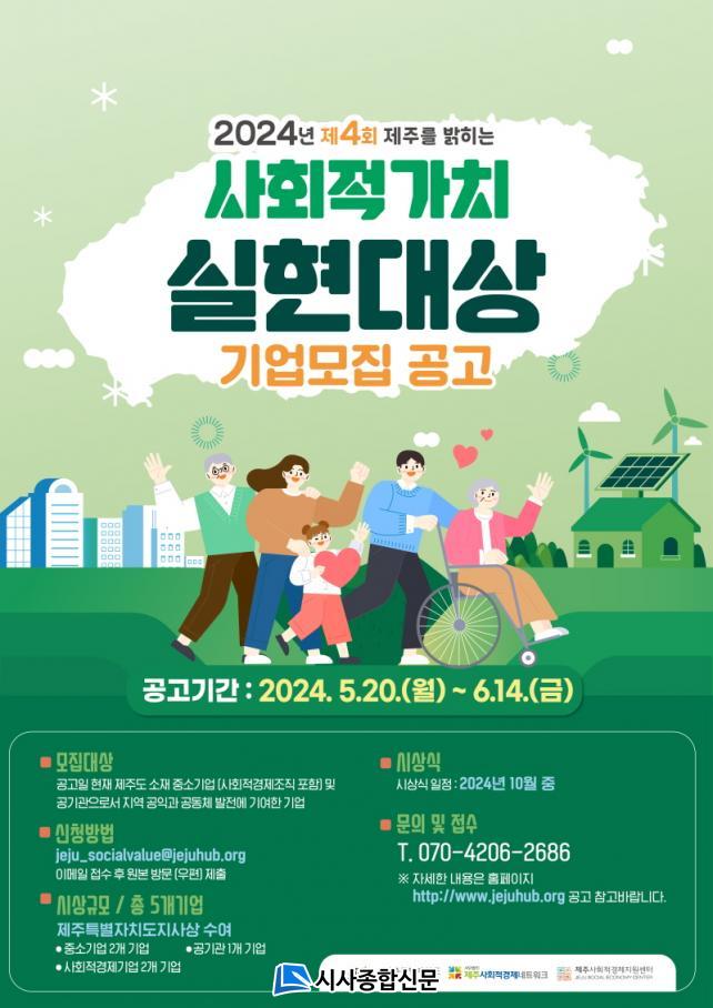¸ðÁý ±â°£Àº 5¿ù 20ÀϺÎÅÍ 6¿ù 14ÀÏ 18½Ã±îÁöÀ̸ç, ½Åû¼·ù´Â ÀÛ¼º ÈÄ ½ºÄµº»°ú ¿øº»À» °¢°¢ À̸ÞÀÏ(jeju_socialvalue@jejuhub.org)°ú ¿ìÆí ¶Ç´Â Á÷Á¢ Á¦ÃâÇØ¾ß ÇÑ´Ù. ½Ã»ó½ÄÀº 2024³â Á¦ÁÖ»çȸÀû°æÁ¦ÇѸ¶´ç Çà»ç¿Í ÇÔ²² 10¿ù Áß¿¡ ÁøÇàµÉ ¿¹Á¤ÀÌ´Ù.