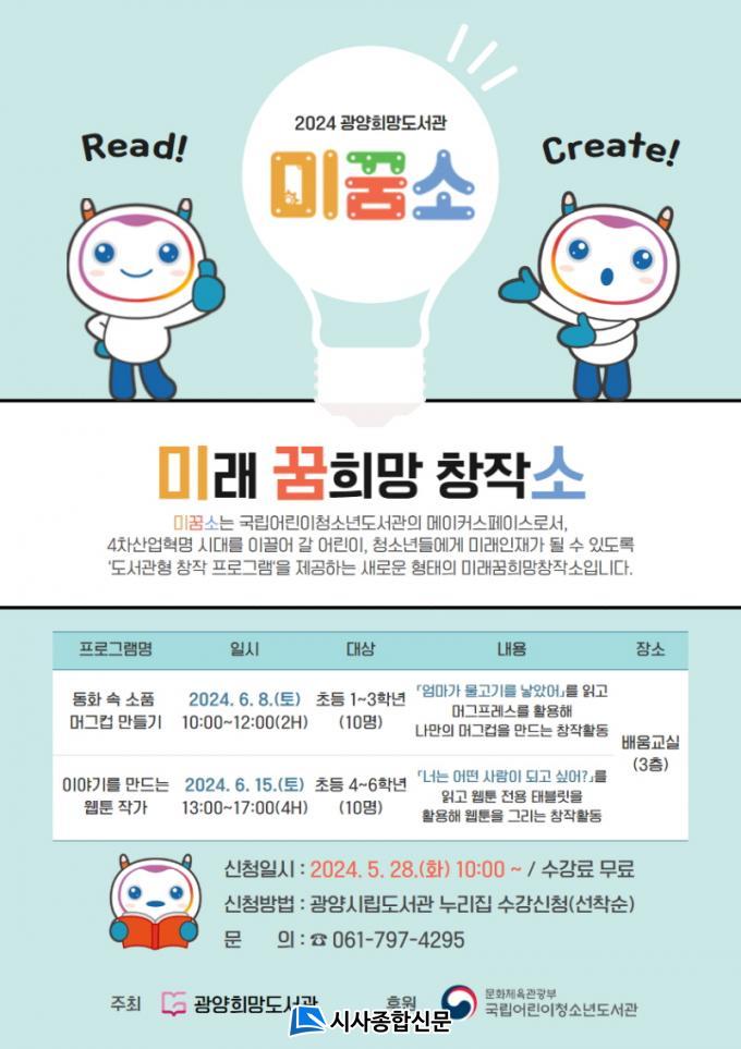 Àç·áºñ´Â ¹«·áÀ̸ç, Âü¿©¸¦ ¿øÇÏ´Â ¾î¸°ÀÌ´Â ¿À´Â 28ÀÏ ¿ÀÀü 10½ÃºÎÅÍ ±¤¾ç½Ã¸³µµ¼°ü ´©¸®Áý¿¡¼ ½ÅûÇÒ ¼ö ÀÖ´Ù. ÇÁ·Î±×·¥¿¡ ´ëÇÑ ÀÚ¼¼ÇÑ »çÇ×Àº ±¤¾çÈñ¸Áµµ¼°üÀ¸·Î ¹®ÀÇ(¢Ï 061-797-4295)ÇÏ¸é µÈ´Ù.