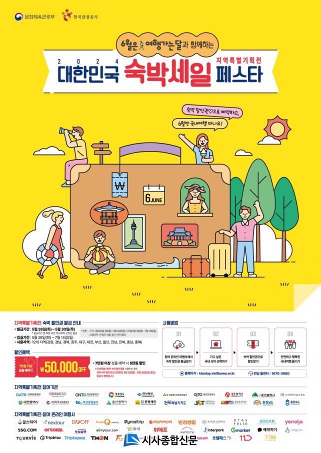 ¡®2024 ´ëÇѹα¹ ¼÷¹Ú¼¼ÀÏ Æä½ºÅ¸¡¯´Â ¿Â¶óÀÎÀ» ÅëÇØ ±¹³» ¼÷¹Ú»óǰ ¿¹¾à ½Ã ÇÒÀÎÄíÆùÀ» Á¦°øÇÏ´Â »ç¾÷À¸·Î ¼öµµ±Ç(¼¿ï, ÀÎõ, °æ±â)À» Á¦¿ÜÇÑ Àü±¹¿¡¼ »ç¿ëÇÒ ¼ö ÀÖ´Ù. ¼÷¹ÚÇÒÀÎ Àû¿ë±â°£Àº 5¿ù 28ÀϺÎÅÍ 7¿ù 14ÀϱîÁöÀ̸ç, ÇÒÀÎ ÄíÆùÀº 5¿ù 28ÀϺÎÅÍ 5¿ù 30ÀϱîÁö 3ÀÏ µ¿¾È ¹ß±Þ¹ÞÀ» ¼ö ÀÖ´Ù. ÇÑ ÄíÆù ´ç ÀüºÏÀÚÄ¡µµ¿Í Àç´ÜÀº 2¸¸¿øÀ» Áö¿øÇϰí, Çѱ¹°ü±¤°ø»ç´Â 3¸¸¿øÀ» Áö¿øÇÑ´Ù.