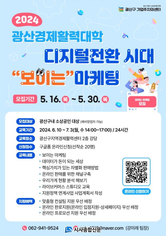 ±³À° Àå¼Ò´Â ±¤»ê±¸ Áö¿ª°æÁ¦È°·Â¼¾ÅÍ 2Ãþ °´çÀÌ´Ù. 1Â÷´Â ÀÌ´Þ 30ÀϱîÁö, 2Â÷´Â 6¿ù 14ÀϱîÁö °¢ 20¸íÀ» ¼±Âø¼øÀ¸·Î ±³À°»ýÀ» ¸ðÁýÇÑ´Ù. ½ÅûÀº ±¤»ê±¸ ±â¾÷ÁÖÄ¡ÀǼ¾ÅÍ ´©¸®Áý, È«º¸¹°¿¡ Àִ ť¾Æ¸£(QR) ÄÚµå µîÀ» ÅëÇØ ¿Â¶óÀÎÀ¸·Î Á¢¼öÇÑ´Ù.