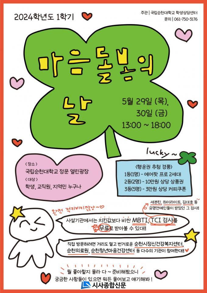 ±¹¸³¼øÃµ´ë ¡®¸¶À½µ¹º½ÀÇ ³¯¡¯Àº 5¿ù ¸¶Áö¸· ÁÖÀÎ 29(¼ö)Àϰú 30ÀÏ(¸ñ) 13½ÃºÎÅÍ 18½Ã±îÁö ¿î¿µÇÑ´Ù. ±¹¸³¼øÃµ´ë Çлý»ó´ã¼¾ÅÍ ÀÚü »ó´ã ÇÁ·Î±×·¥°ú ¼øÃµÀÇ·á¿ø, ¸¶Àε帵ũ, Á¤½Å°Ç°º¹Áö¼¾ÅÍ µî Áö¿ª À¯°ü±â°üÀÇ ¿©·¯ ½É¸® »ó´ã ÇÁ·Î±×·¥À» ¸¸³ªº¼ ¼ö ÀÖ´Ù.