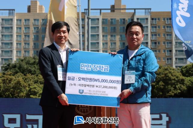 [½Ã»çÁ¾ÇսŹ® = °í¼º¹Î ±âÀÚ] Á¦ÁÖÁ¦ÀϰíµîÇб³ Ãѵ¿¹®È¸(ȸÀå ±è¾ç±Ù, 25ȸ)´Â Áö³ 19ÀÏ ´ë¿îµ¿Àå¿¡¼ ¿¸° °³±³ 69Áֳ⠱â³ä ¡®Á¦43ȸ ÀϰíÀÎ ÃàÁ¦ÀÇ ³¯¡¯Çà»ç¿¡¼ ¸ð±³¿¡ <¸¸¸¸ÀåÇбÝ> ¿À¹é¸¸ ¿ø(5,000,000¿ø) ±âŹÇÏ¿´´Ù.