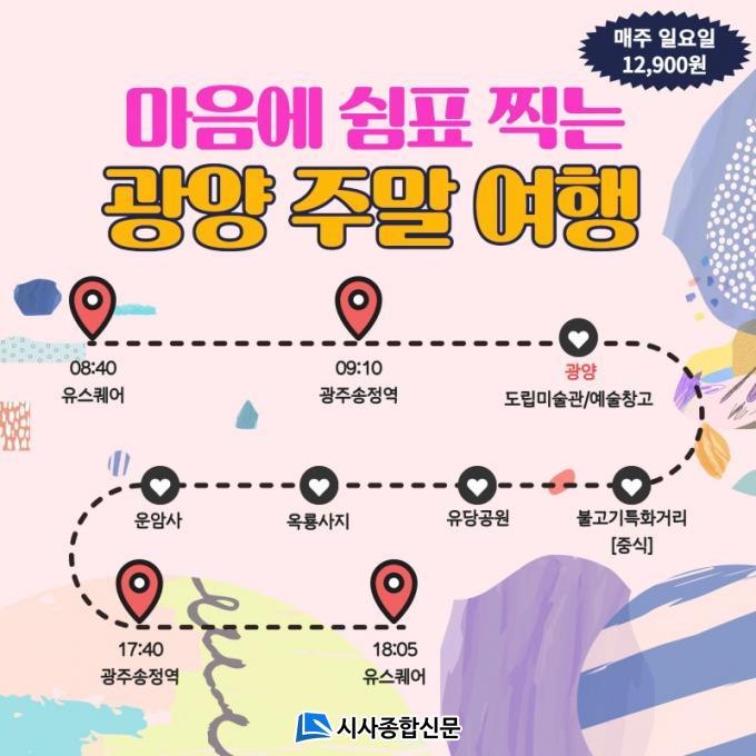 ¸ÅÁÖ ÀÏ¿äÀÏ ±¤ÁÖ À¯½ºÄù¾î(8½Ã 40ºÐ) 2¹ø Ȩ ¶Ç´Â ±¤ÁÖ¼ÛÁ¤¿ª(9½Ã 10ºÐ) Åýý°Àå¿¡¼ ž½ÂÇØ Àü³²µµ¸³¹Ì¼ú°ü, ±¤¾ç¿¹¼úâ°í µîÀ» ¸ÕÀú °ü¶÷ÇÑ´Ù. ÀÌ¾î ¼Ãµº¯ ±¤¾çºÒ°í±âƯȰŸ®¿¡¼ Á¡½ÉÀ» Áñ±ä ÈÄ À¯´ç°ø¿ø, ¿Á·æ»çÁö, ¿î¾Ï»ç µî¿¡¼ °í¿äÇÏ°í Æí¾ÈÇÑ ÁÖ¸» ¿ÀÈĸ¦ Áñ±â°í À¯½ºÄù¾î(18½Ã 5ºÐ)¿¡ µµÂøÇÏ´Â ÄÚ½ºÀÌ´Ù.