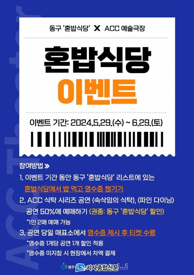 Âü¿© ¹æ¹ýÀº µ¿±¸ È¥¹ä½Ä´çÀ» ÀÌ¿ëÇÑ ÈÄ ±¹¸³¾Æ½Ã¾Æ¹®ÈÀü´ç ´©¸®Áý(www.acc.go.kr)¿¡¼ ACC ½ÄŹ ½Ã¸®Áî °ø¿¬À» 50% ÇÒÀÎµÈ °¡°Ý¿¡ ¿¹¸ÅÇÏ¸é µÈ´Ù. °ø¿¬ ´çÀÏ ¸ÅÇ¥¼Ò¿¡¼ È¥¹ä½Ä´ç ÀÌ¿ë ¿µ¼öÁõ°ú ¿¹¸Å ƼÄÏÀ» Á¦½ÃÇÏ°í °ø¿¬À» °ü¶÷ÇÒ ¼ö ÀÖ´Ù.