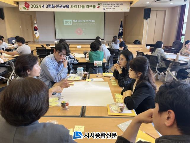 ¿öÅ©¼ó 1ºÎ¿¡¼´Â Çб³±Þº°·Î 4¡¤3ÆòÈ¡¤ÀαDZ³À° ÁÖ°£¿¡ °¢ Çб³¿¡¼ ½ÇõÇÏ¿´´ø »ç·Ê¸¦ ¸ðµÒ ±¸¼º¿ø¿¡°Ô ¼Ò°³Çϸç Çб³±Þº° ÆòÈ‧ÀαDZ³À° Ȱ¼ºÈ ¹æ¾ÈÀ» ³íÀÇÇÏ´Â ½Ã°£À» °¡Á³´Ù. 2ºÎ¿¡¼´Â Á¦ÁÖºÏÃÊ ¾çÁöÀº ±³»ç°¡ ¡®»õ·Î¿î ½Ã°¢ÀÇ 4¡¤3À̾߱â, ºñ±ØÀ» ³Ñ¾î »ó»ýÀ¸·Î¡¯¶ó´Â ÁÖÁ¦·Î ¹ßÇ¥ÇÏ¿´´Ù.