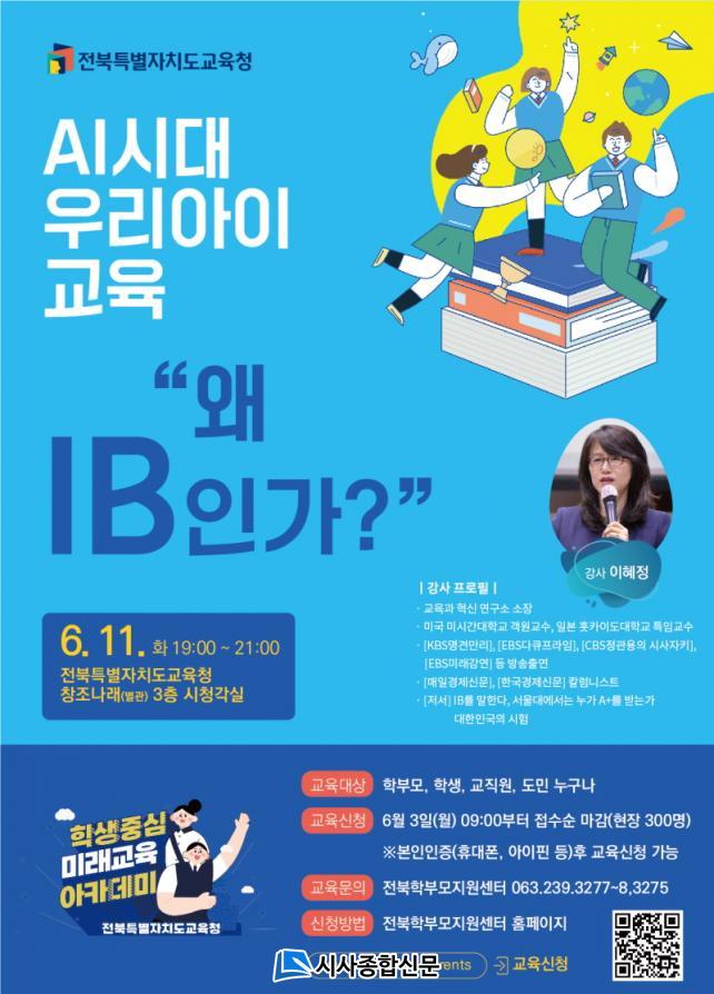 ÀüºÏ±³À°Ã»Àº ±³À°°øµ¿Ã¼¿Í ±³À°ºñÀüÀ» °øÀ¯¡¤¼ÒÅëÇϰí, ¹Ì·¡»çȸ ´ëÀÀ ¿ª·® °È¸¦ À§ÇØ ¡®ÇлýÁ᫐ ¹Ì·¡±³À° ¾ÆÄ«µ¥¹Ì¡¯¸¦ °³ÃÖÇϰí ÀÖ´Â °¡¿îµ¥ 6¿ù¿¡´Â ¡®AI½Ã´ë ¿ì¸® ¾ÆÀÌ ±³À°, ¿Ö IBÀΰ¡?¡¯¸¦ ÁÖÁ¦·Î Ư°À» ¿¬´Ù.