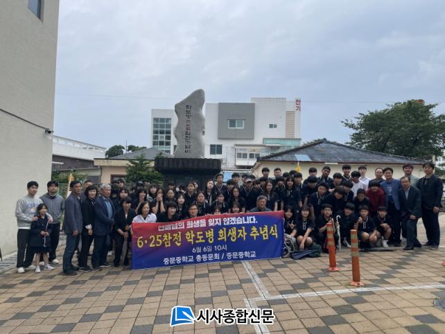 ÇÑÆí, Áß¹®ÁßÇб³´Â 1950³â 4³âÁ¦ ºÎ¹®ÁßÇб³¿´´Âµ¥, 2Çг⿡¼ 40¸í, 3Çг⿡¼ 29¸í, 4Çг⿡¼ 20¸í µî ¾à 90¿© ¸íÀÇ ¿ì¸® µ¿¹® ¼±¹èµéÀÌ À°±º°ú ÇØº´¿¡ Çеµº´À¸·Î ÂüÀüÇÑ ¹Ù ÀÖÀ¸¸ç À̸¦ ±â¸®±â À§ÇØ 2013³â 10¿ù 11ÀÏ Áß¹®ÁßÇб³Ãѵ¿¹®È¸¿Í Çеµº´ 6.25 ÂüÀü ±â³äºñ °Ç¸³ ÃßÁøÀ§¿øÈ¸¿¡¼ ±â³äºñ¸¦ ¼¼¿ü´Ù.