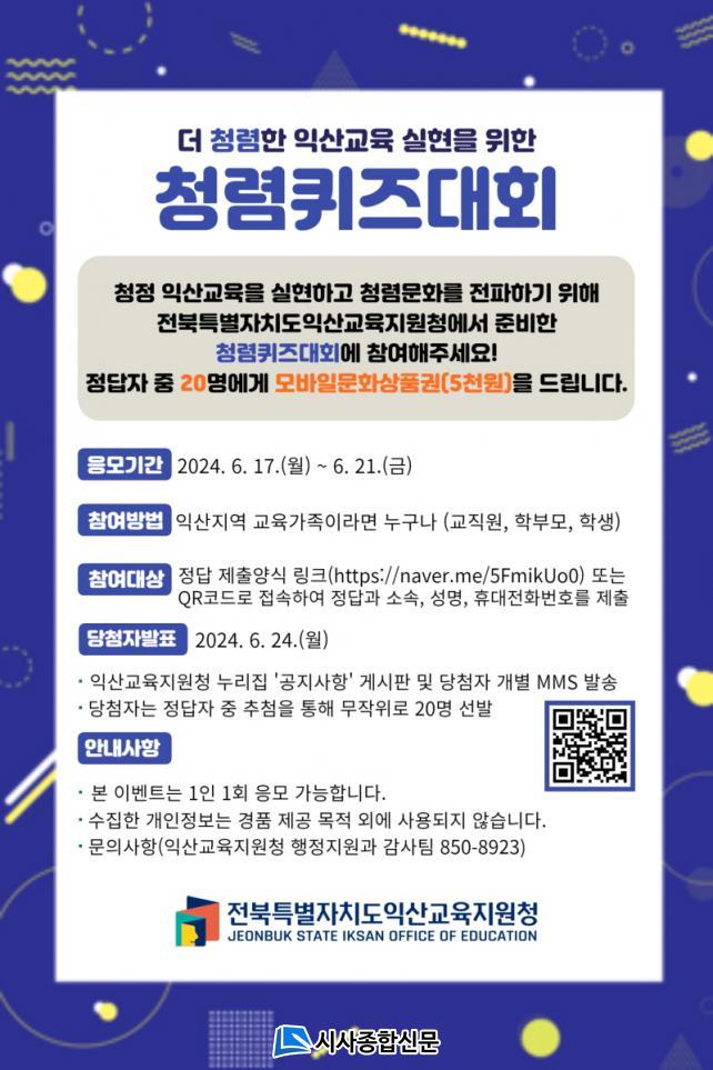 ÄûÁî´ëȸ ÁÖ³»¿ëÀ¸·Î´Â ûʱÝÁö¹ý µî û·Å¿¡ °üÇÑ »çÇ×À¸·Î Âü¿©ÀÚ´Â ¸µÅ©(https://naver.me/5FmikUo0) ¶Ç´Â QRÄڵ忡 Á¢¼ÓÇØ ÃÑ 3¹®Á¦¸¦ Ç®°Ô µÈ´Ù. 3¹®Á¦¸¦ ¸ðµÎ ¸ÂÃá Á¤´äÀÚ Áß 20¸í¿¡°Ô´Â ¸ð¹ÙÀϹ®È»óǰ±ÇÀÌ »óǰÀ¸·Î Áö±ÞµÉ ¿¹Á¤ÀÌ´Ù.