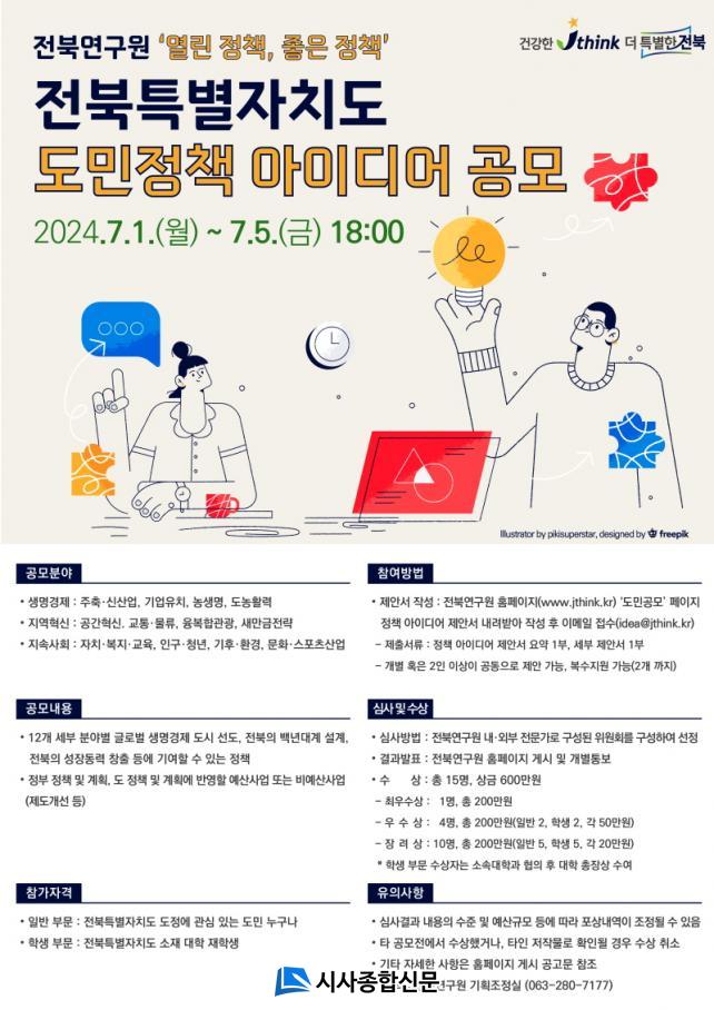 ÀüºÏƯº°ÀÚÄ¡µµ µµÁ¤¿¡ °ü½ÉÀÌ ÀÖ´Â µµ¹Î°ú ÀüºÏÀÚÄ¡µµ ¼ÒÀç ´ëÇÐ ÀçÇлýÀÌ¸é °³ÀÎ ¶Ç´Â °øµ¿À¸·Î ´©±¸³ª Âü¿©ÇÒ ¼ö ÀÖ´Ù. ½Åû ¹æ¹ýÀº ÀüºÏ¿¬±¸¿ø ȨÆäÀÌÁö µµ¹Î°ø¸ð °Ô½ÃÆÇÀÇ `Á¤Ã¥ ¾ÆÀ̵ð¾î Á¦¾È¼`¸¦ ³»·Á¹Þ¾Æ ÀÛ¼ºÇÏ¿© 7¿ù 1ÀϺÎÅÍ 7¿ù 5ÀÏ ¿ÀÈÄ 6½Ã±îÁö À̸ÞÀÏ(idea@jthink.kr)·Î Á¢¼öÇÏ¸é µÈ´Ù.