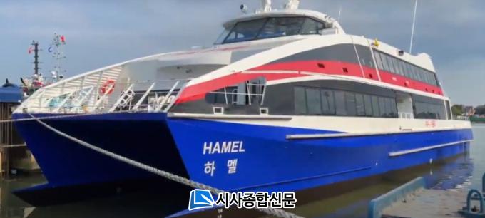 150¾ï¿øÀ» µé¿© °ÇÁ¶ÇÑ ÀÌ ¼±¹ÚÀº ¡®ÇϸáÈ£¡¯·Î ¸í¸íµÆÀ¸¸ç ÃÑÅæ¼ö 590Åæ(±æÀÌ 42.16m, Æø 11.3m, ±íÀÌ 3.8m)ÀÇ ¾Ë·ç¹Ì´½ ÇÕ±Ý ÀçÁúÀ̸ç, ¿öÅÍÁ¬ 4±â¸¦ ÀåÂøÇØ ÃÖ´ë 42³ëÆ®(½Ã¼Ó ¾à 80km)ÀÇ ¼Óµµ¸¦ ³¾ ¼ö ÀÖ´Ù. Á¤¿øÀº ½Â°´ 423¸í, ¼±¿ø 7¸íÀÌ´Ù.