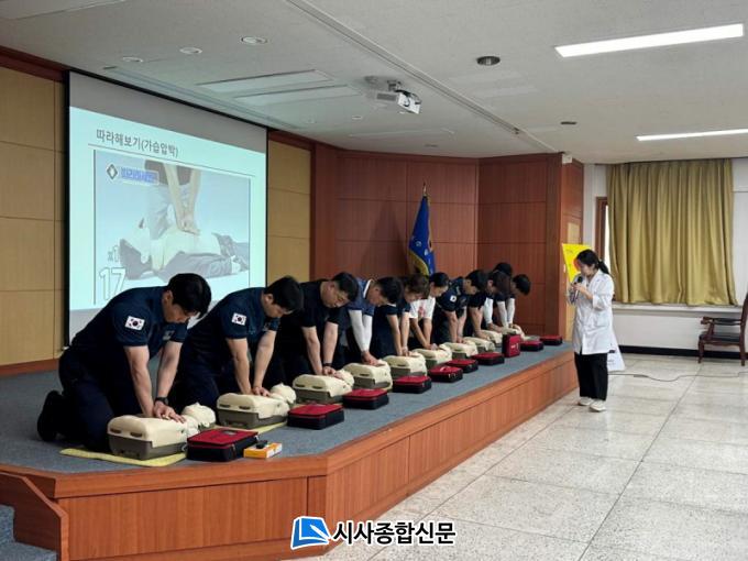 À̳¯ ±³À°Àº ÀÀ±Þ»óȲ¿¡¼ ¡ãÀǽÄÈ®ÀÎ ¿ä·É ¡ã119 ½Å°í¿ä·É ¡ã¿Ã¹Ù¸¥ ½ÉÆó¼Ò»ý¼ú ÀÚ¼¼¿Í ¹æ¹ý ¡ã½ÉÆó¼Ò»ý¼ú ½Ç½À ¡ãÀÚµ¿½ÉÀåÃæ°Ý±â(AED) »ç¿ë¹æ¹ý µî ½Ç½À À§ÁÖ·Î ÁøÇà, °æÂû°ø¹«¿øµéÀÇ ÇöÀå ´ëÀÀ ½Ã ÀÀ±Þ»óȲ ´ëó ´É·Â Çâ»ó¿¡ ÁÖ¾ÈÁ¡À» µ×´Ù.