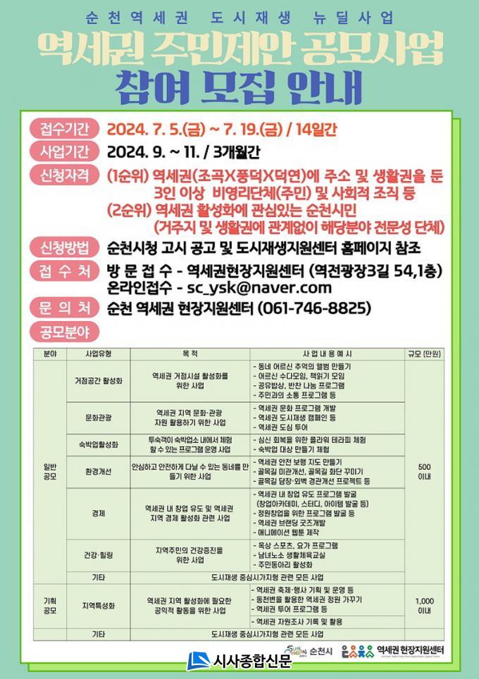 [½Ã»çÁ¾ÇսŹ® = Àå¹Î±Ô ±âÀÚ] ¼øÃµ½Ã(½ÃÀå ³ë°ü±Ô)´Â ¿ª¼¼±Ç ÀÏ¿ø µµ½ÃÀç»ý »ç¾÷±¸¿ª(Á¶°î․dz´ö․´ö¿¬)À» ´ë»óÀ¸·Î 2024³â ÁÖ¹ÎÁ¦¾È °ø¸ð»ç¾÷ ½ÅûÀÚ¸¦ ¿À´Â 19ÀϱîÁö ¸ðÁýÇÑ´Ù.