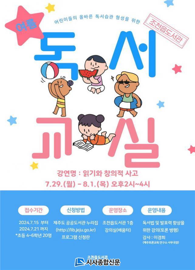 ÇÁ·Î±×·¥ Âü¿©¸¦ ¿øÇÏ´Â ¾î¸°ÀÌ´Â ¿À´Â 7¿ù 15ÀϺÎÅÍ 21ÀϱîÁö Á¦ÁÖµµ °ø°øµµ¼°ü ´©¸®Áý(http://lib.jeju.go.kr)ÀÇ µµ¼°ü ÇÁ·Î±×·¥ ½Åû¶õ¿¡¼ ½ÅûÇÏ¸é µÈ´Ù.