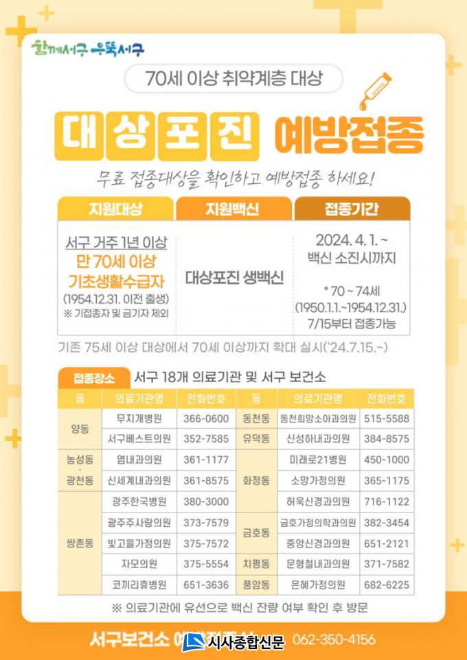 | ±¤Áֽà ¼±¸, ´ë»óÆ÷Áø ¿¹¹æÁ¢Á¾ È®´ë ½Ç½Ã 70¼¼ ÀÌ»ó ±âÃÊ»ýȰ¼ö±ÞÀÚ ´ë»óÆ÷Áø ¹«·á Áö¿ø |