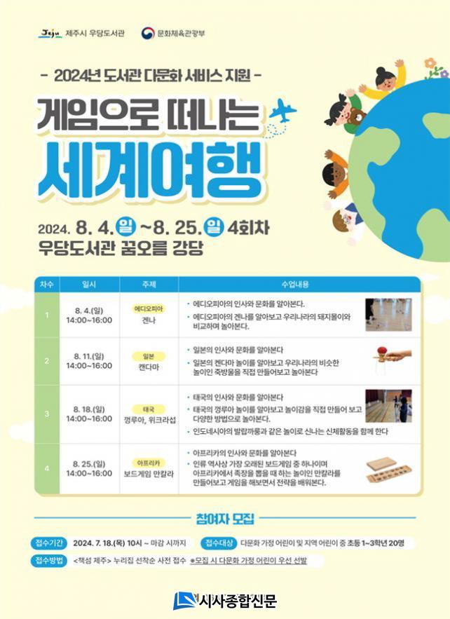 <°ÔÀÓÀ¸·Î ¶°³ª´Â ¼¼°è¿©Çà>Àº ´Ù¹®È °¡Á¤ ¾î¸°À̸¦ Æ÷ÇÔÇØ Ãʵî 1~3Çг⠾ÀÌ 20¸íÀ» ´ë»óÀ¸·Î ¿À´Â 8¿ù 4ÀϺÎÅÍ 8¿ù 25ÀϱîÁö ¸ÅÁÖ ÀÏ¿äÀÏ ¿ÀÈÄ 2½ÃºÎÅÍ 2½Ã°£ µ¿¾È ¿ì´çµµ¼°ü ²Þ¿À¸§ °´ç¿¡¼ ¿î¿µÇÑ´Ù.