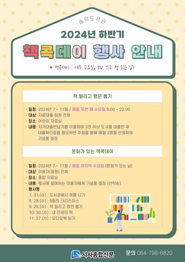 ¡®Ã¥ÄÛµ¥ÀÌ¡¯´Â ÀÚ·á½Ç ÀÌ¿ë ÃËÁøÀ» À§ÇÑ ¿ùº° ´Ù¾çÇÑ µ¶¼ À̺¥Æ® ¿î¿µ ÇÁ·Î±×·¥À¸·Î, ¸Å¿ù µÎ ¹øÂ° ¼ö¿äÀÏ¿¡´Â ¾î¸°ÀÌ ÀÚ·á½Ç¿¡¼¡®Ã¥ ºô¸®°í Çà¿î »Ì±â¡¯¸¦ ¿î¿µÇϴµ¥, ÀÚ°¡´ëÃâ¹Ý³³±â¸¦ ÀÌ¿ëÇÏ¿© 3±Ç ÀÌ»ó µµ¼¸¦ ´ëÃâÇÑ ÈÄ ´ëÃâÈ®ÀÎÁõÀ» ÀÀ¸ðÇϸé Ãß÷À» ÅëÇØ ¸Å¿ù 2¸íÀ» ¼±Á¤ÇÏ¿© ±â³äǰÀ» ÁõÁ¤ÇÑ´Ù.