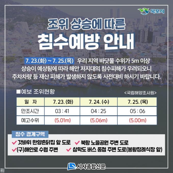 [½Ã»çÁ¾ÇսŹ® = ¿À½ÂÅà ±âÀÚ] ¸ñÆ÷½Ã´Â ´ëÁ¶±âÀÎ ¿À´Â 23ÀϺÎÅÍ 25ÀÏ(»õº® 2½Ã ~ 6½Ã)»çÀÌ ¹Ù´å¹° ¼öÀ§°¡ 5.0m ÀÌ»ó(Á¶¼®Ç¥»ó 7/23 ÃÖ°í 5.06m) »ó½ÂÀÌ ¿¹»óµÊ¿¡ µû¶ó ÇÇÇØ¸¦ ÀÔÁö ¾Êµµ·Ï öÀúÇÑ ´ëºñ¸¦ ´çºÎÇß´Ù.