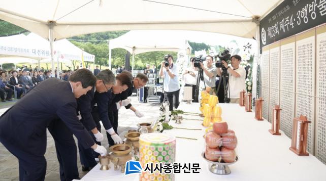 Á¦ÁÖ4‧3Èñ»ýÀÚÀ¯Á·È¸°¡ ÁÖÃÖÇϰí Á¦ÁÖ4‧3Çà¹æºÒ¸íÀÎÀ¯Á·ÇùÀÇȸ°¡ ÁÖ°üÇÑ À̹ø ÁøÈ¥Á¦´Â ¿À¿µÈÆ Á¦ÁÖµµÁö»ç, ÀÌ»óºÀ µµÀÇȸ ÀÇÀå, ±è±¤¼ö ±³À°°¨, ¾ç¼ºÈ« ÇàºÒÀÎÀ¯Á·ÇùÀÇȸÀå, ±èâ¹ü Á¦ÁÖ4‧3Èñ»ýÀÚÀ¯Á·È¸Àå, ±èÁ¾¹Î 4‧3ÆòÈÀç´Ü ÀÌ»çÀå, Á¦ÁÖÁö¿ª ±¹È¸ÀÇ¿øÀ» ºñ·ÔÇØ 4‧3À¯Á· µî 600¿©¸íÀÌ Âü¼®Çß´Ù.