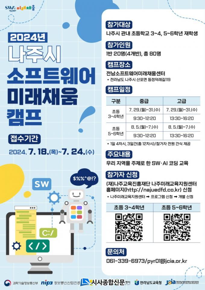 [½Ã»çÁ¾ÇսŹ® = ¿À½ÂÅà ±âÀÚ] ³ªÁÖ½Ã(½ÃÀå À±º´ÅÂ)´Â Áö¿ª ÃʵîÇлýµéÀÇ ¼ÒÇÁÆ®¿þ¾î(SW) ±â¼ú ÇнÀÀ» À§ÇÑ ¡®2024³â ³ªÁֽà ¼ÒÇÁÆ®¿þ¾î ¹Ì·¡Ã¤¿ò Ä·ÇÁ¡¯ Âü°¡ ÇлýÀ» ¿À´Â 24ÀϱîÁö ¼±Âø¼ø ¸ðÁýÇÑ´Ù°í 22ÀÏ ¹àÇû´Ù.