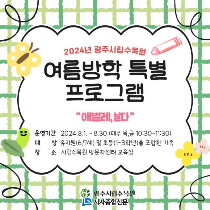 Âü°¡´ë»óÀº À¯Ä¡¿ø, ÃʵîÇб³ 1~3Çг⠵î 6¼¼ ÀÌ»ó 10¼¼ ÀÌÇÏ ¾î¸°ÀÌ¿Í °¡Á·ÀÌ´Ù. Á¢¼ö´Â 7¿ù 25ÀϺÎÅÍ 8¿ù 30ÀϱîÁö ±¤ÁÖ±¤¿ª½Ã ´©¸®Áý ¹Ù·Î¿¹¾à(https://www.gwangju.go.kr/reserve/main.do)À» ÅëÇØ ÇÏ¸é µÈ´Ù.
