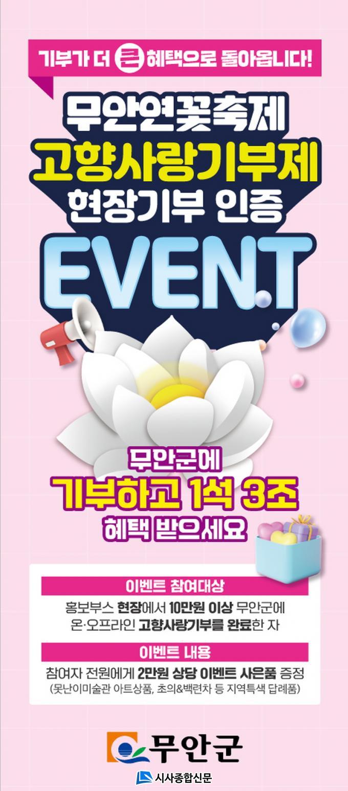¹«¾È±ºÀº ÃàÁ¦ ±â°£ Áß °íÇâ»ç¶û±âºÎÁ¦ È«º¸ºÎ½º¸¦ ¹æ¹®ÇÏ¿© ¿Â¿ÀÇÁ¶óÀÎÀ¸·Î 10¸¸¿ø ÀÌ»ó ¹«¾È±º¿¡ ÇöÀå ±âºÎ¸¦ ¿Ï·áÇÑ Âü¿©ÀÚ Àü¿ø¿¡°Ô ´ä·Êǰ ¿Ü 2¸¸ ¿ø »ó´çÀÇ »çÀºÇ°À» Ãß°¡ ÁõÁ¤ÇÒ °èȹÀÌ´Ù. Ãß°¡ »çÀºÇ°Àº Áö¿ª Ư»ö °¡µæÇÑ ¹«¾È±º Ư»êǰ(¸ø³À̹̼ú°ü ¾ÆÆ®»óǰ, ÃÊÀÇÂ÷, ¹é·ÃÂ÷ µî) Áß 1°³°¡ ÀÓÀÇ Á¦°øµÈ´Ù.