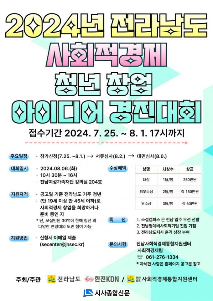 Âü¿©ÀÚ ¸ðÁýÀº 8¿ù 1ÀϱîÁöÀ̸ç, Âü¿© ½Åû¼ ¹× »ç¾÷°èȹ(PPT) µî °ü·Ã ¼·ù¸¦ ±¸ºñÇØ Àü³²»çȸÀû°æÁ¦ÅëÇÕÁö¿ø¼¾ÅÍ »çȸÀû°æÁ¦ÆÀ(secenter@jnsec.kr)À¸·Î Á¦ÃâÇÏ¸é µÈ´Ù. Âü¿© ´ë»óÀº Àü³²µµ³» û³â(¸¸ 19¼¼ ÀÌ»ó ¸¸ 45¼¼ ÀÌÇÏ)À̸ç, ¸ðÁý ÀοøÀÇ 30%¿¡ ÇÑÇØ û³â ¿Ü ´Ù¾çÇÑ ¿¬·É´ëÀÇ µµ¹Îµµ ½ÅûÇÒ ¼ö ÀÖ´Ù.