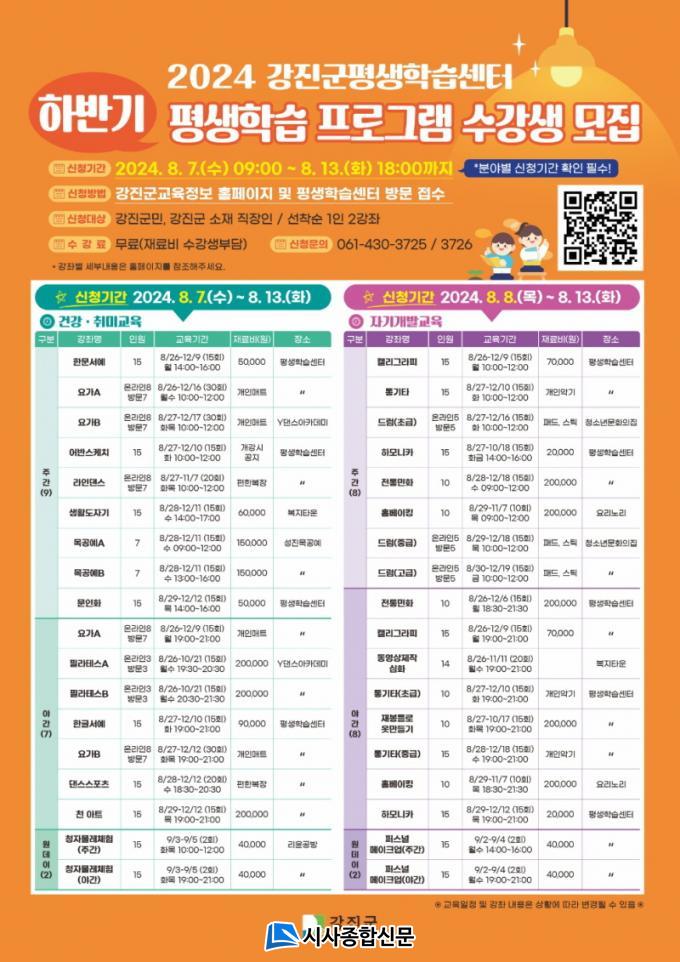 Æò»ýÇнÀ ¼ö° ½Åû¿¡ µû¸¥ ÀÚ¼¼ÇÑ »çÇ×Àº °Áø±º ȨÆäÀÌÁö(www.gangjin.go.kr) °í½Ã‧°ø°í ¶Ç´Â °Áø±º ±³À°Á¤º¸ ȨÆäÀÌÁö(Æò»ýÇнÀ-°Á½Åû)¸¦ Âü°íÇϰųª, Ãѹ«°ú ±³À°±³·ùÆÀ(¢Ï061-430-3725)·Î ¹®ÀÇÇÏ¸é µÈ´Ù.