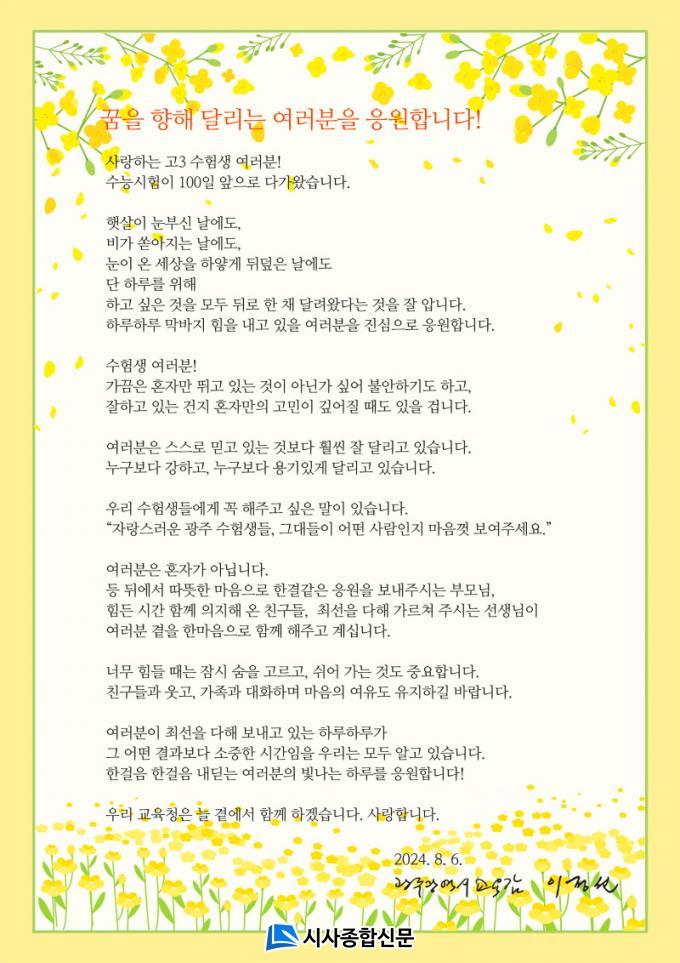ÀÌ ±³À°°¨Àº ¼Çѹ®¿¡¼ ¡°ÀÚ¶û½º·¯¿î ±¤ÁÖ ¼öÇè»ýµé, ±×´ëµéÀÌ ¾î¶² »ç¶÷ÀÎÁö ¸¶À½²¯ º¸¿©ÁÖ¶ó¡±¸ç ¡°¿©·¯ºÐµé °ç¿¡´Â ºÎ¸ð´Ô, Ä£±¸µé, ¼±»ý´Ôµé, ±¤ÁÖ±³À°°¡Á· ¸ðµÎ°¡ ÇѸ¶À½À¸·Î ÇÔ²²Çϰí ÀÖÀ¸´Ï ¼ö´É½ÃÇèÀÌ ³¡³ª´Â ¼ø°£±îÁö ÃÖ¼±À» ´ÙÇØ Áֱ⠹ٶõ´Ù¡±°í ¹àÇû´Ù. ÀÌ¾î ¡°ÇѰÉÀ½ ÇѰÉÀ½ ³»µó´Â ¼öÇè»ýÀÇ ºû³ª´Â ÇϷ縦 ÀÀ¿øÇÑ´Ù¡±°í ÀüÇß´Ù.
