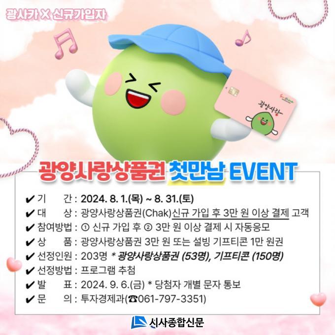±¤¾ç½Ã´Â ¼Òºñ°¡ ¸¹Àº ¿©¸§ ÈÞ°¡Ã¶ÀÎ 8¿ù¿¡ À̹ø À̺¥Æ®¸¦ ÁøÇàÇØ ±¤¾ç»ç¶û»óǰ±Ç ½Å±Ô°¡ÀÔÀÚ¸¦ À¯ÀÔ½Ã۰í Áö¿ª°æÁ¦¸¦ Ȱ¼ºÈÇÑ´Ù´Â ±¸»óÀÌ´Ù.