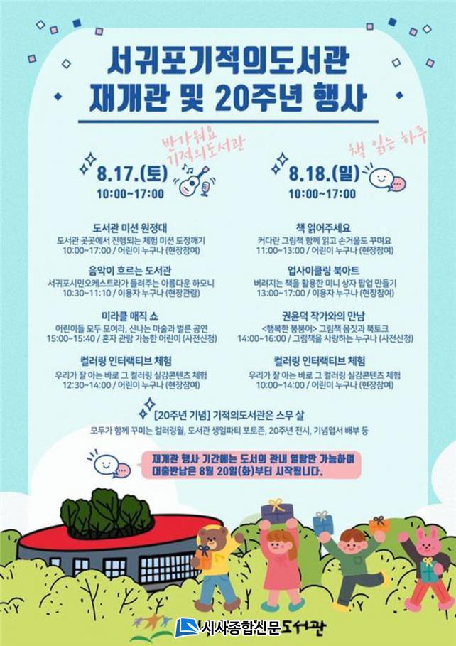 8.17.(Åä) ~ 8.18.(ÀÏ) ¾çÀϰ£ ÁøÇàµÇ´Â Àç°³°ü ¹× 20ÁÖ³â Çà»ç´Â ¿ÀÀü 10½ÃºÎÅÍ ¿ÀÈÄ 5½Ã±îÁö ¿î¿µµÇ¸ç, ±ÇÀ±´ö ÀÛ°¡¿ÍÀÇ ¸¸³², ¼±ÍÆ÷½Ã¹Î¿ÀÄɽºÆ®¶óÀÇ ÃàÇϰø¿¬, ¾î¸°À̸¦ À§ÇÑ ¸¶¼ú °ø¿¬, µµ¼°ü ³îÀÌ È°µ¿, ºÏ¾ÆÆ® üÇè, Ã¥ ÀоîÁÖ¼¼¿ä µîÀÇ ´Ù¾çÇÑ ÇÁ·Î±×·¥ÀÌ ÁøÇàµÉ ¿¹Á¤ÀÌ´Ù. Àç°³°ü Çà»ç Áß¿¡´Â µµ¼ÀÇ °ü³» ¿¶÷¸¸ °¡´ÉÇϸç, ´ëÃâ¹Ý³³Àº 8¿ù 20ÀÏ(È)ºÎÅÍ ½ÃÀ۵ȴÙ.