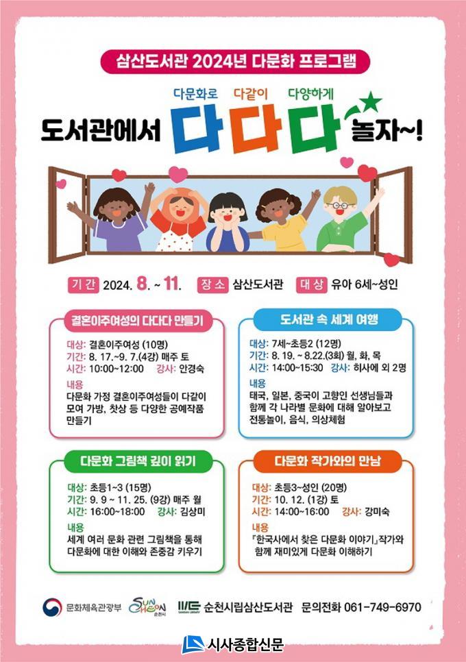 ¼øÃµ½Ã °ü°èÀÚ´Â ¡°¿ì¸® Áö¿ª»çȸ ´Ù¹®È °¡Á¤ÀÌ Á¡Á¡ Áõ°¡ÇÔ¿¡ µû¶ó, µµ¼°ü¿¡¼ ´Ù¾çÇÑ °èÃþÀÌ Âü¿©ÇÒ ¼ö ÀÖ´Â ´Ù¹®È °ü·Ã ÇÁ·Î±×·¥À» ¿î¿µÇÏ¿©, ´Ù¹®È¿¡ ´ëÇÑ ÀÌÇØ¿Í Æ÷¿ë·ÂÀ» ³ôÀ̰í Áö¿ª»çȸ ±¸¼º¿øÀ¸·Î ´Ù ÇÔ²² ¾î¿ì·¯Áö´Â ÀåÀ» ¸¶·ÃÇϰڴ١±°í ¹àÇû´Ù.