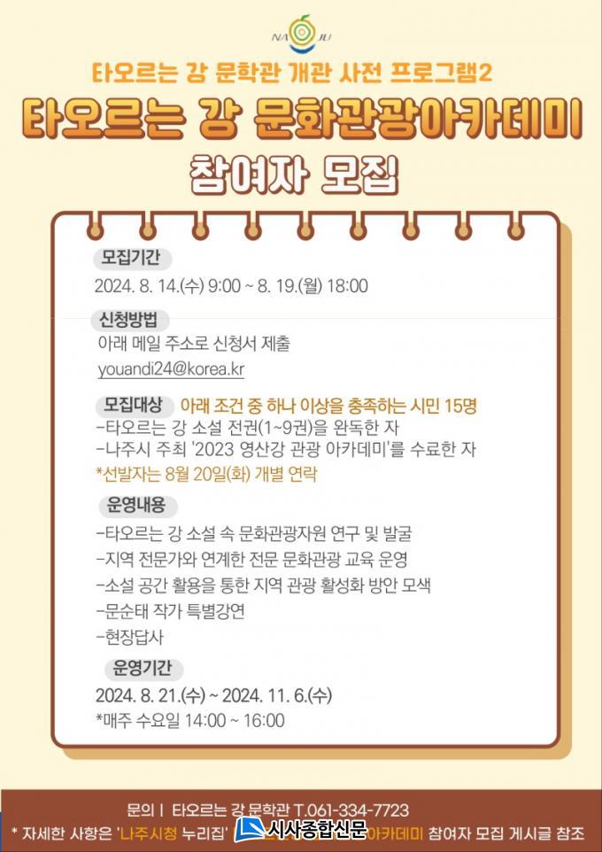 Âü¿©¸¦ Èñ¸ÁÇÒ °æ¿ì ³ªÁֽà ȨÆäÀÌÁö¸¦ Âü°íÇØ ½Åû¼¸¦ ÀÛ¼ºÇÑ ÈÄ À̸ÞÀÏ·Î Á¢¼öÇÏ¸é µÈ´Ù. ½Åû¹®ÀÇ´Â ³ªÁÖ½Ãû ¹®È¿¹¼ú°ú 061)334-7723.