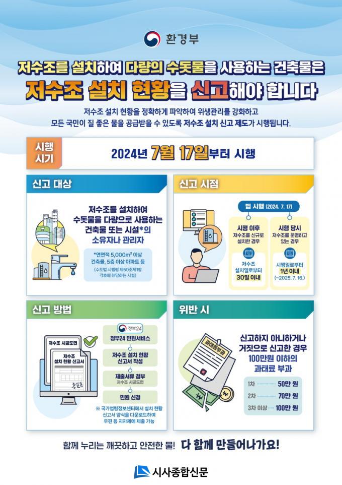 ¶ÇÇÑ, ¹ý ½ÃÇà ´ç½Ã Àú¼öÁ¶¸¦ ¿î¿µ ÁßÀÎ ÇØ´ç °ÇÃ๰ÀÇ ¼ÒÀ¯ÀÚ³ª °ü¸®ÀÚµµ ½ÃÇàÀϷκÎÅÍ 1³â À̳»(~25.07.16.)¿¡ Àú¼öÁ¶ ¼³Ä¡ ÇöȲÀ» ½Å°íÇØ¾ß ÇÑ´Ù. ½Å°í ´ë»óÀº ¿¬¸éÀû 5õ§³ ÀÌ»ó °ÇÃ๰, 2õ§³ ÀÌ»ó µÑ ÀÌ»óÀÇ ¿ëµµ¿¡ »ç¿ëµÇ´Â °ÇÃ๰, 5Ãþ ÀÌ»ó ¾ÆÆÄÆ® µî ¼öµµ¹ý ½ÃÇà·É Á¦50Á¶¿¡¼ È®ÀÎÇÒ ¼ö ÀÖ´Ù.