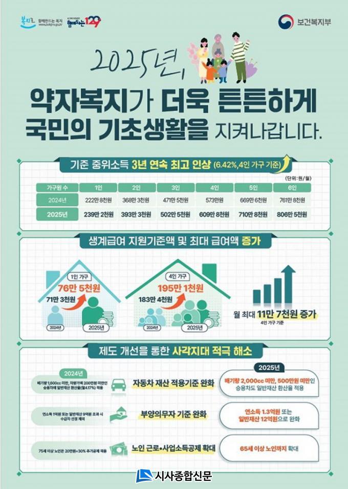 º¸°Çº¹ÁöºÎ´Â 7¿ù 25ÀÏ Á¦73Â÷ Áß¾Ó»ýȰº¸ÀåÀ§¿øÈ¸¸¦ °³ÃÖÇÏ¿© 2025³âµµ ±âÁØ ÁßÀ§¼ÒµæÀ» 6.42%·Î ¿ª´ë ÃÖ´ë ÀλóÇß´Ù. ±âÁØ ÁßÀ§¼ÒµæÀº ±¹¹Î°¡±¸¼ÒµæÀÇ Áß°£°ªÀ¸·Î Á¤ºÎÀÇ 74°³ »ç¾÷ÀÇ ¼±Á¤±âÁØÀÌ µÇ¸ç, ³ô¾ÆÁú¼ö·Ï º¹Áö ¼ºñ½º¸¦ ¹Þ´Â ´ë»óÀÚµµ ´Ã¾î³´Ù.