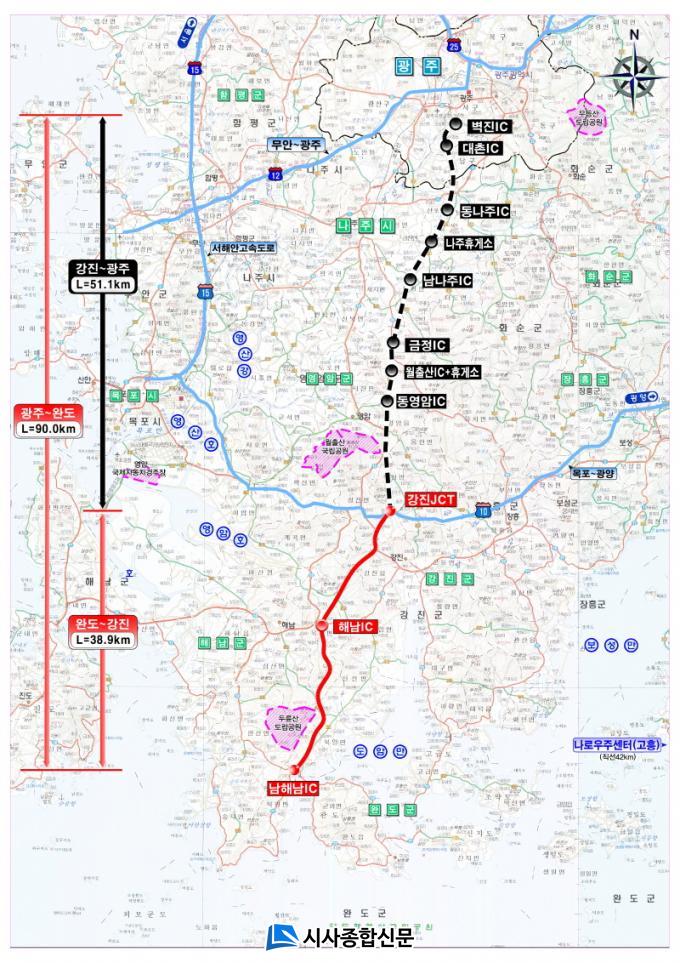 °Áø~¿Ïµµ °í¼Óµµ·Î´Â ¡®Á¦2Â÷ °í¼Óµµ·Î °Ç¼³°èȹ(2021~2025)¡¯¿¡ ¹Ý¿µµÈ ±¹Ã¥»ç¾÷À¸·Î, °Áø±º ÀÛõ¸é¿¡¼ ÇØ³²±º ºÏÆò¸éÀ» ÀÕ´Â 38.9km ±¸°£¿¡ 1Á¶ 5,849¾ï ¿øÀ» ÅõÀÔÇØ 4Â÷·Î¸¦ ½Å¼³ÇÏ´Â ÃÊ´ëÇü °Ç¼³»ç¾÷À¸·Î, 2025³âºÎÅÍ Å¸´ç¼º Á¶»ç ¹× ¼³°è ¿ë¿ªÀ» °ÅÃÄ 2028³â Âø°øµÉ ¿¹Á¤ÀÌ´Ù.