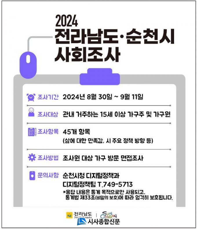 | ¼øÃµ½Ã, 2024³â Àü¶ó³²µµ‧¼øÃµ½Ã »çȸÁ¶»ç¡¯ ½Ç½Ã ¿À´Â 30ÀϺÎÅÍ 9¿ù 11ÀϱîÁö¡¦1,008°³ °¡±¸ Ç¥º»Á¶»ç |