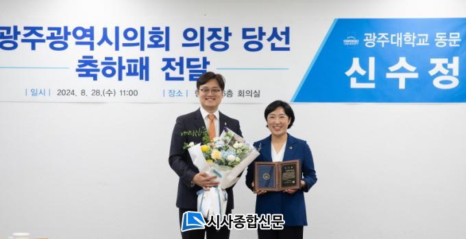 ±¤ÁÖ´ëÇб³(ÃÑÀå ±èµ¿Áø)´Â ½Å¼öÁ¤ ÀÇÀåÀÌ ±¤ÁÖ±¤¿ª½ÃÀÇȸ °³¿ø 34³â ¸¸¿¡ ¿©¼º ÃÖÃÊ·Î ÀÇÀåÀ¸·Î ¼±ÃâµÅ ±¤ÁÖ´ëÀÎ(»ê¾÷µðÀÚÀÎÇаú 96³â Á¹¾÷)ÀÇ ±àÁö¸¦ µå³ôÀÌ°í ¸ð±³ÀÇ ¸í¿¹¸¦ ºû³½ °øÀ» Ä¡ÇÏÇϸç ÃàÇÏÆÐ¸¦ Àü´ÞÇß´Ù.