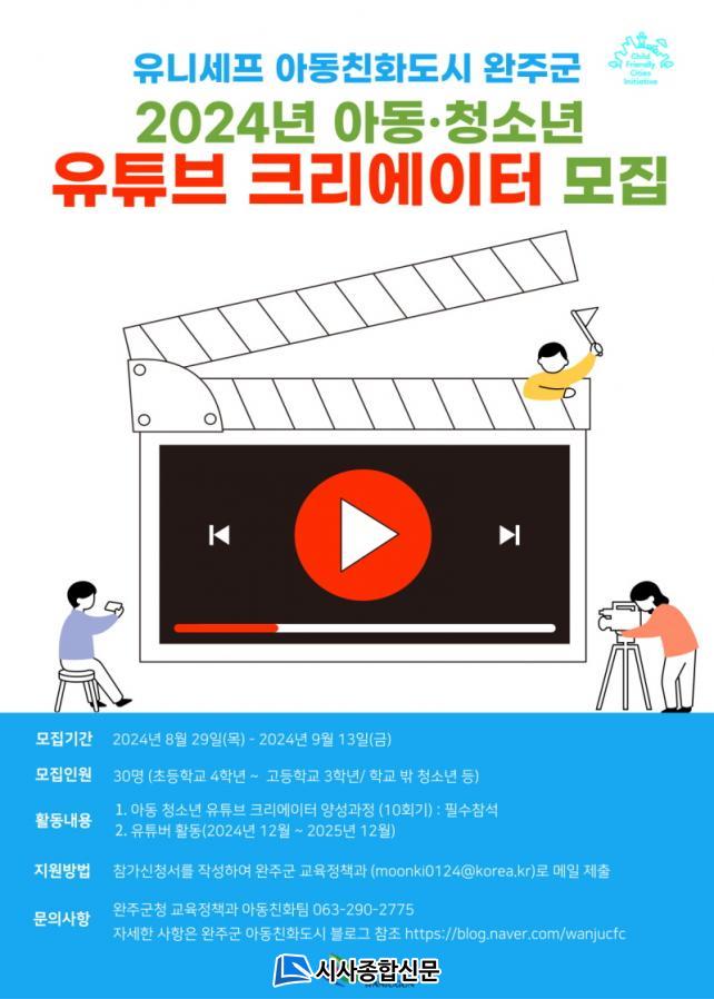 ÀÌ¿¡ ¿ÏÁÖ±ºÀº ¾Æµ¿¡¤Ã»¼Ò³â À¯Æ©ºê Å©¸®¿¡ÀÌÅ͸¦ ¸ðÁýÇÑ´Ù. °ü³» ÃʵîÇб³ 4ÇгâºÎÅÍ °íµîÇб³ 3Çгâ ÀçÇлý±îÁö ¶Ç´Â Çб³¹Û û¼Ò³â(9¼¼~24¼¼) µî ÃÑ 30¸íÀÌ´Ù.