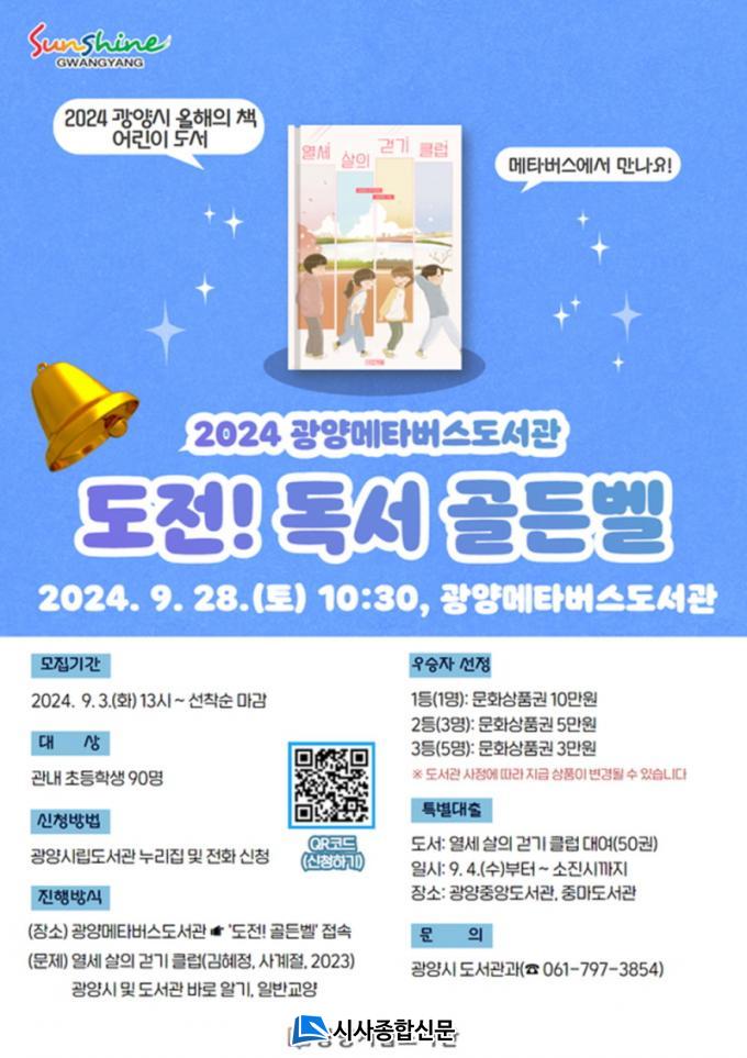 ÃâÁ¦ ¹®Á¦´Â 2024³â ±¤¾ç½Ã ¿ÃÇØÀÇ Ã¥ ¾î¸°ÀÌ µµ¼ ¡®¿¼¼ »ìÀÇ °È±â Ŭ·´¡¯°ú ±¤¾ç½Ã¡¤±¤¾ç½Ã¸³µµ¼°ü¿¡ ´ëÇÑ »ó½Ä ¹®Á¦°¡ ÇÔ²² ÃâÁ¦µÇ¸ç, 1~3µî ÀÔ»óÀÚ ÃÑ 9¸í¿¡°Ô´Â ¹®È»óǰ±ÇÀ» Â÷µî Áö±ÞÇÒ ¿¹Á¤ÀÌ´Ù. Âü¿© ½ÅûÀº 9¿ù 3ÀϺÎÅÍ ÀüÈ¿Í ±¤¾ç½Ã¸³µµ¼°ü ´©¸®Áý(http://lib.gwangyang.go.kr/)À» ÅëÇØ °¡´ÉÇÏ¸ç µ¶¼ °ñµçº§ ½ÅûÀÚ´Â 9¿ù 4ÀϺÎÅÍ ÇÑ ´Þ°£ ¡¸¿¼¼ »ìÀÇ °È±â Ŭ·´¡¹À» ¼±Âø¼øÀ¸·Î Ưº°´ëÃâ ÇÒ ¼ö ÀÖ´Ù.