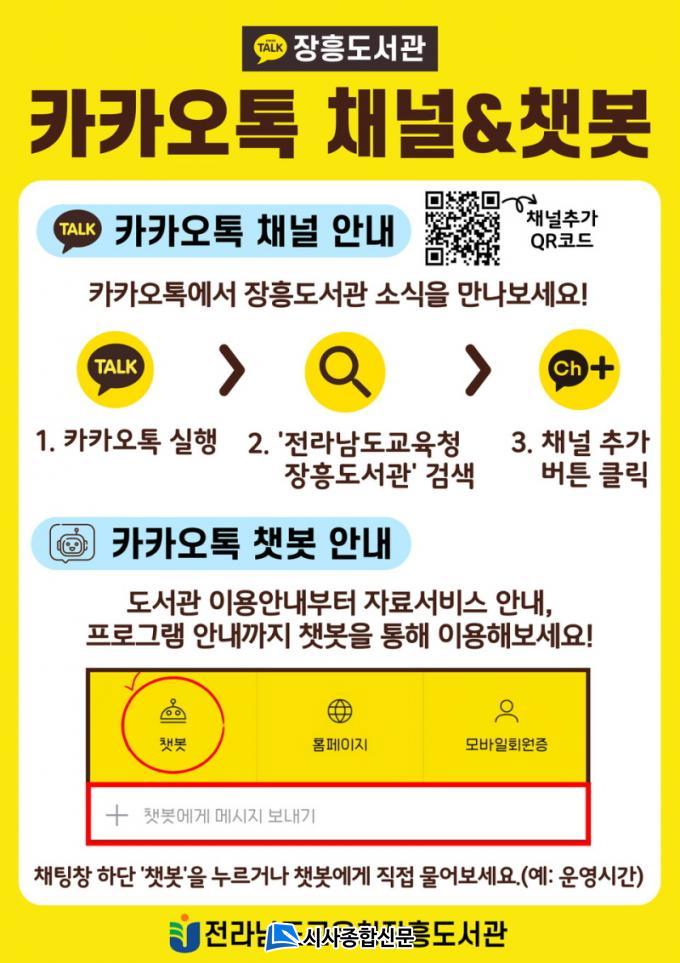 īī¿ÀÅå ä³Î ÀÌ¿ë ¹æ¹ýÀ¸·Î´Â īī¿ÀÅå Ä£±¸ °Ë»öâ¿¡ ¡®Àü¶ó³²µµ±³À°Ã»ÀåÈïµµ¼°ü¡¯À» °Ë»öÇϰųª È«º¸¹°ÀÇ QRÄڵ带 ½ºÄµÇÏ¿© ä³Î Ãß°¡¸¦ Çϸé ÀåÈïµµ¼°üÀÇ ÃֽŠ¼Ò½ÄÀ» ¹Þ¾Æº¼ ¼ö ÀÖ´Ù.