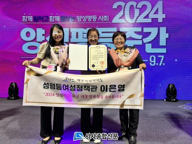 [½Ã»çÁ¾ÇսŹ® = °í¼º¹Î ±âÀÚ] Á¦ÁÖÆ¯º°ÀÚÄ¡µµ´Â ÀÌÀº¿µ Á¦ÁÖµµ ¼ºÆòµî¿©¼ºÁ¤Ã¥°üÀÌ 2ÀÏ °³ÃÖµÈ ¡®2024³â ¾ç¼ºÆòµîÁÖ°£ ±â³ä½Ä¡¯¿¡¼ ´ëÅë·É ǥâÀ» ¼ö»óÇß´Ù°í ¹àÇû´Ù. ¿©¼º°¡Á·ºÎ°¡ ÁÖÃÖÇÑ À̹ø Çà»ç¿¡¼ ÀÌÀº¿µ Á¤Ã¥°üÀº ¼±µµÀûÀÎ ¾ç¼ºÆòµîÁ¤Ã¥ ÃßÁøÀ» À§ÇØ ³ë·ÂÇÑ °øÀûÀ» ÀÎÁ¤¹Þ¾Æ ¿µ¿¹¸¦ ¾È¾Ò´Ù.