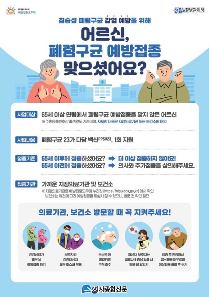 Á¢Á¾ ´ë»óÀÚ´Â Æó·Å±¸±Õ(PPSV 23°¡)À» Á¢Á¾ÇÏÁö ¾ÊÀº 65¼¼ ÀÌ»ó ¾î¸£½ÅÀ¸·Î, ½ÅºÐÁõÀ» ÁöÂüÇÏ¿© º¸°Ç¼Ò, º¸°ÇÁö¼Ò ¶Ç´Â ÇØ´ç À§Å¹ÀÇ·á±â°ü(°íÈﱺ 16°³¼Ò)À» ¹æ¹®Çϸé Á¢Á¾ÇÒ ¼ö ÀÖ´Ù.