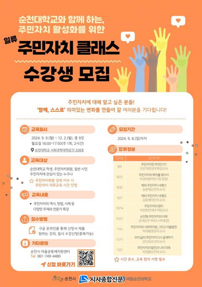 ¡®ÀÏ·ù ÁÖ¹ÎÀÚÄ¡ Ŭ·¡½º¡¯´Â ÁÖ¹ÎÀÚÄ¡·Â Çâ»óÀ» ÅëÇØ ÁֹΠ½º½º·Î Áö¿ª¹®Á¦¸¦ ÇØ°áÇϰí Á¤Ã¥ °áÁ¤¿¡ Âü¿©Çϱâ À§ÇÑ ÁÖ¹ÎÀÚÄ¡¸®´õ ¾ç¼º Àü¹® ±³À°°úÁ¤ÀÌ´Ù. 9¿ù 9ÀϺÎÅÍ 12¿ù 2ÀϱîÁö ÃÑ 9°ÁÂ(18½Ã°£)·Î ¼øÃµ´ëÇб³ »çȸ°úÇдëÇÐ ÇàÁ¤Çаú Àü°ø°Àǽǿ¡¼ ¿î¿µµÈ´Ù.