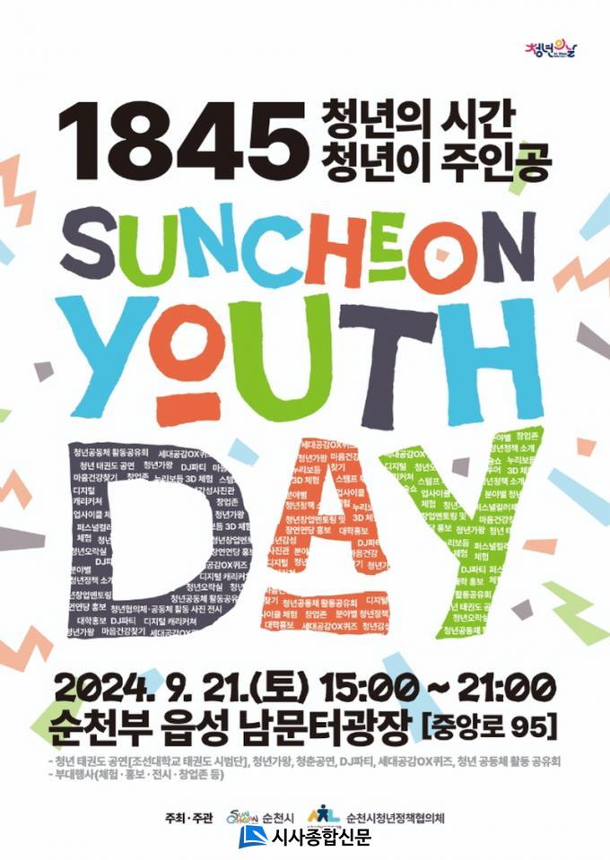¿À´Â 21ÀÏ ¿ÀÈÄ 3½ÃºÎÅÍ 9½Ã±îÁö ¼øÃµºÎ À¾¼º¿¡¼ ¿¸®´Â ¡®2024 ¼øÃµ û³âÀÇ ³¯¡¯ Çà»ç´Â ¡®1845 û³âÀÇ ½Ã°£, û³âÀÌ ÁÖÀΰø¡¯À» ÁÖÁ¦·Î À¯°øÀÚ Ç¥Ã¢ ¹× û³â ¼¼´ëº° ºñÀü¼±Æ÷, ¼¼´ë°ø°¨ OXÄûÁî, û³âűǵµ °ø¿¬, û³â°¡¿Õ, DJÆÄƼ µî û³âµéÀÌ Áñ±â°í Âü¿©ÇÏ´Â ÇÁ·Î±×·¥À¸·Î ¿î¿µµÇ¸ç, ¼ö»ó¹«´ë¿¡¼´Â Èú¸µ¶óÀ̺ê ûÃá°ø¿¬ÀÌ ÆîÃÄÁø´Ù.