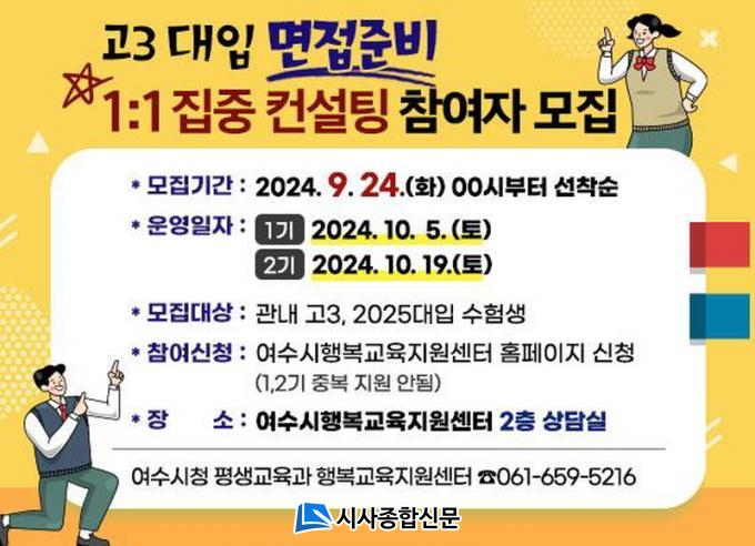 | ¿©¼ö½Ã, ´ëÀÔ ¼öÇè»ýÀ» À§ÇÑ ¡®¸éÁ¢ Áغñ 1:1 ÁýÁß »ó´ã¡¯ ¿î¿µ 9¿ù 24ÀϺÎÅÍ ¿©¼ö½ÃÇູ±³À°Áö¿ø¼¾ÅÍ ´©¸®Áý ¿Â¶óÀÎ Á¢¼ö |