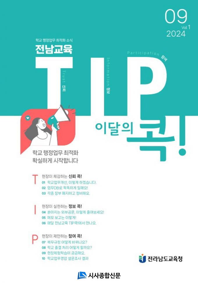 ¸ÕÀú ¡®Àü³²±³À° TIP(ÆÁ)ÄÛ¡¯Àº Çб³ ÇöÀå¿¡¼ ÇÊ¿ä·Î ÇÏ´Â Çб³¾÷¹« ÃÖÀûÈ ³»¿ëÀ» ´ã¾Æ ¸Å¿ù ÇöÀå¿¡ ¾È³»ÇÏ´Â À¥ ¼Ò½ÄÁö´Ù. ¼Ò½ÄÁö´Â T(Trust, ½Å·Ú), I(Information, Á¤º¸), P(Participation, Âü¿©) ¼¼ °¡Áö·Î ±¸¼ºµÈ´Ù.