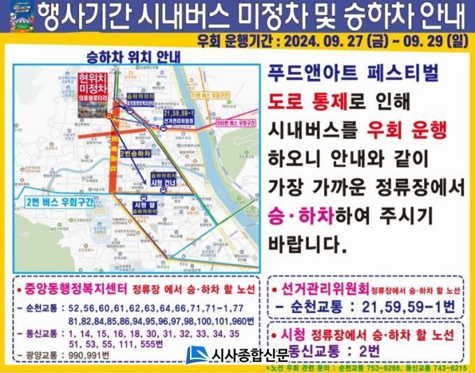 [½Ã»çÁ¾ÇսŹ® = Àå¹Î±Ô ±âÀÚ] ¼øÃµ½Ã(½ÃÀå ³ë°ü±Ô)´Â ¡®2024 ¼øÃµ Ǫµå¾Ø¾ÆÆ®Æä½ºÆ¼¹ú¡¯Çà»ç ±â°£ÀÎ ¿À´Â 27ÀϺÎÅÍ ~ 29ÀϱîÁö 3Àϰ£ Áß¾Ó·Î ÀϺΠ±¸°£(ÀÇ·á¿ø·ÎÅ͸®~³²±³¿À°Å¸®)ÀÇ Â÷·®ÀÌ ÅëÁ¦µÊ¿¡ µû¶ó ½Ã³»¹ö½º ³ë¼±µµ ÀϺΠ¿ìȸ ¿îÇàÇÑ´Ù°í ¹àÇû´Ù.